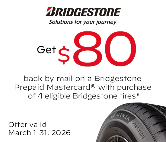 Purchase a set of four select Bridgestone tires and you may be eligible to receive an $80 Bridgestone Prepaid Mastercard® by online rebate. Offer valid on qualifying tires purchased at an authorized dealer and picked up or installed between 12:00 a.m. EST March 1, 2026 and 11:59 p.m. EDT March 31, 2026.