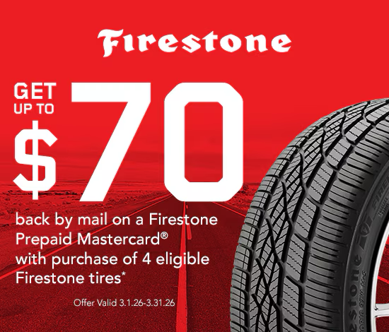 Purchase a set of four select Firestone tires and you may be eligible to receive up to a $70 Firestone Prepaid Mastercard® by online rebate. Offer valid on qualifying tires purchased at an authorized dealer and picked up or installed between 12:00 a.m. EST March 1, 2026 and 11:59 p.m. EDT March 31, 2026.