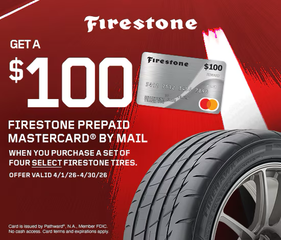 When you purchase a set of four select Firestone tires from an authorized Honda dealer you may be eligible to receive a $100 Firestone Prepaid Mastercard by mail. Offer valid on qualifying tires purchased from an authorized Honda dealer, and picked-up or installed between 12:00 a.m. EDT April 1, 2026 and 11:59 p.m. EDT April 30, 2026. Please confirm eligibility with your Honda dealer.