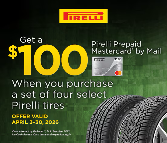 When you purchase a set of four select Pirelli tires from an authorized Honda dealer you may be eligible to receive a $100 Pirelli Prepaid Mastercard by mail. Offer valid on qualifying tires purchased from an authorized Honda dealer, and picked-up or installed between 12:00 a.m. EDT April 3, 2026 and 11:59 p.m. EDT April 30, 2026. Please confirm eligibility with your dealer.